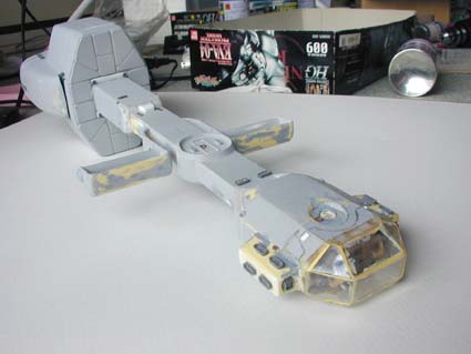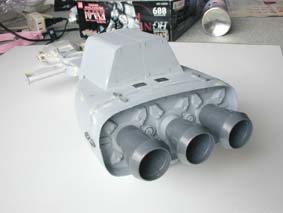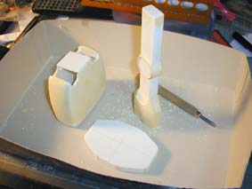 | 図面引いて、まずは、パーツごとに箱組したものに ポリパテをもりもりして、削りーの、また、盛って削りーの。コクピット部は、エアロックまでを製作。 | エンジンブロック、この形にするのに、一週間以上かかったよ。